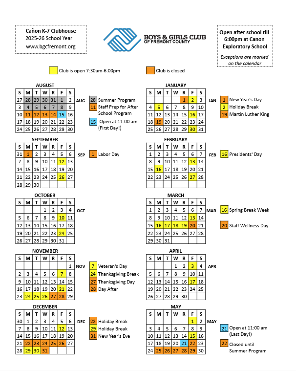 The Boys & Girls Club of Fremont County provides a safe, positive environment for young people when school is out of session. We serve youth ages 5-12 at our Cañon K-7 Club, and ages 12-18 at our 4th Street Teen Club. After school transportation is available from some RE-1 schools. Click on the buttons above to find out more about each club or click the button below to learn more about what we stand for!